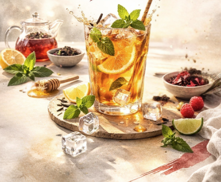 Fruchtige Eisteemischungen und praktisches Zubehör für erfrischenden, selbstgemachten Eistee.