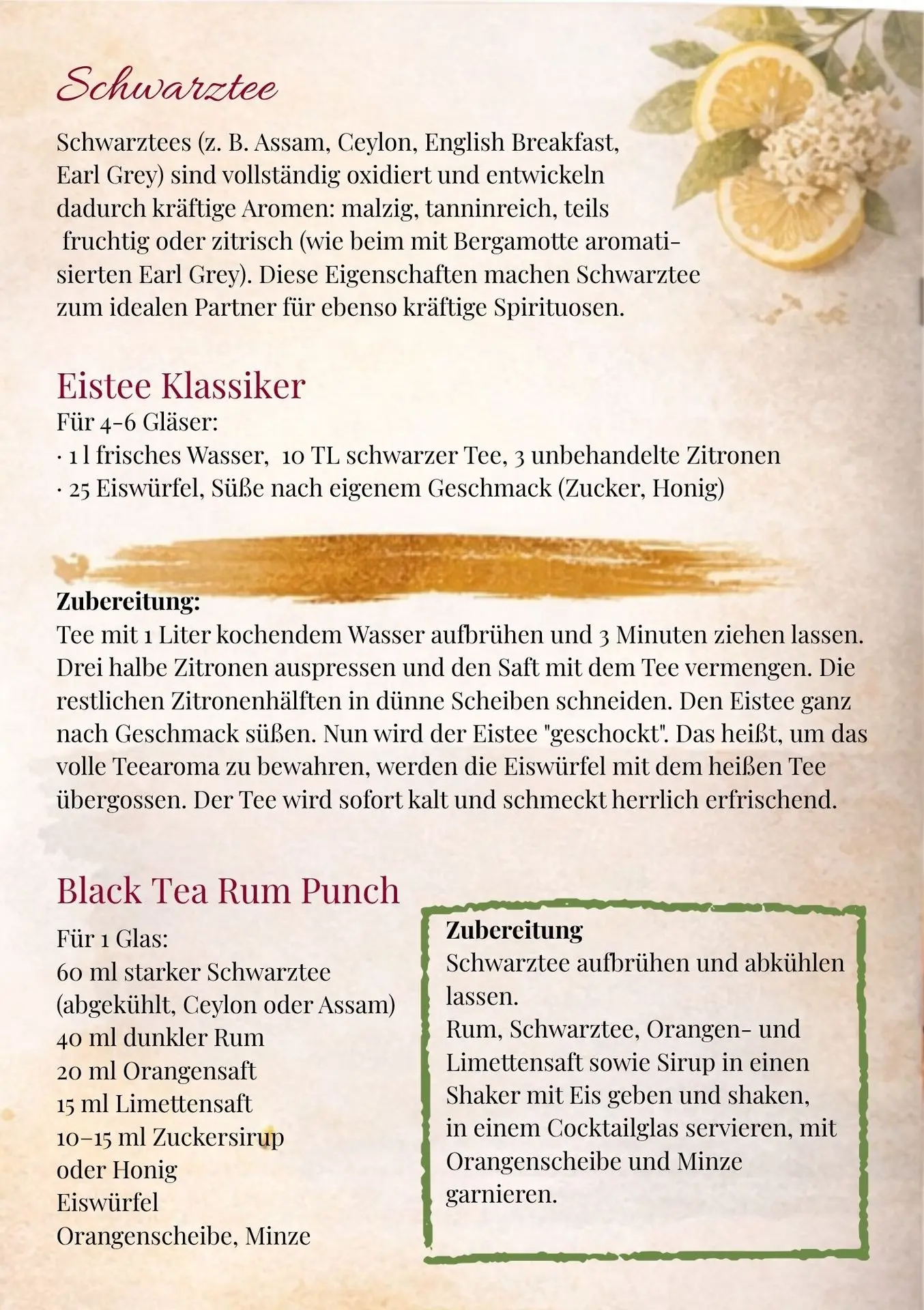 Neben Schwarztee eignen sich auch Grün- , Früchte-, sowie Kräutertees als Basis für den Eistee. Veredelt mit weiteren Zutaten, ein beliebtes Erfrischungsgetränk.